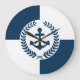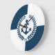 design com âncora e cor de louro em fundo geométrico azul e branco