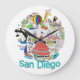 Tanto para ver e fazer na cidade de praia San Diego. San Diego é representado através de uma coleção instável de marcos e atrações icônicos, incluindo a vida selvagem, a arquitetura e os parques de diversão. As cores brilhantes e os designs lúcidos transmitem as ofertas vibrantes e diversas da cidade.