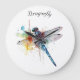 pintura aquosa de uma bela libélula colorida, segurando-a num galho sobre fundo branco