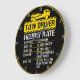Este relógio de parede humorístico estabelece os termos para os serviços de dois condutores. Contra um fundo preto com uma jante amarela brilhante, ele apresenta um reboque e um carro no topo, seguido de um gráfico "HORLY RATE" espirituoso. As taxas aumentam para observar, ajudar, trabalhar nisso primeiro, ou dizer a eles como fazer seu trabalho, adicionando um trabalho divertido aos espectadores. A ferramenta design também pode ser usada para adicionar texto personalizado se você quiser seu nome ou empresa neste relógio. Você pode personalizar a cor do quadro para qualquer cor que desejar, entrando na ferramenta design.