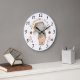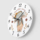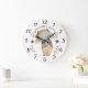 Um adorável relógio personalizado de aquarela para quarto de bebê ou quarto de criança com uma elefante menina, com um elefantinho fofo de macacão e laço no cabelo, em tons de cinza e laranja, sobre um fundo de pinceladas de aquarela pastel em laranja e pêssego. A tipografia é uma fonte decorativa única com floreios.