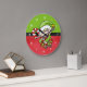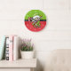 Um relógio festivo com um elfo fofo segurando-se em uma cana doce listrada vermelha e branca. Colocado sobre um fundo verde e vermelho.