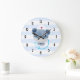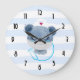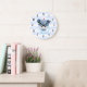 Um relógio com uma bela ilustração de um urso azul vestindo um chapéu de enfermeira com um pequeno coração nele. Também vestindo uma máscara protetora e tem um estetescópio azul.