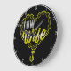 Este relógio de parede é um tributo amoroso à esposa de um motorista de reboque. Ele apresenta uma forma cardíaca feita de correntes de ouro, com as palavras "Esposa do TOW" mostradas de forma destacada no centro em uma fonte amarela correspondente. O relógio tem um fundo preto elegante e uma borda branca nítida, criando um contraste visual impressionante. Você pode personalizar a cor do quadro para qualquer cor que desejar, entrando na ferramenta design.