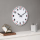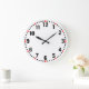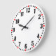Uma bela face de relógio de estilo analógico simples, números ousados atraentes com os minutos marcados com pontos pretos e as horas em pontos vermelhos ligeiramente maiores.