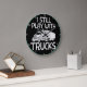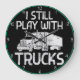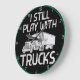 Este relógio é uma declaração nostálgica e orgulhosa de alguém que nunca superou o seu amor pelos caminhões. Em um fundo preto com uma vibrante borda azul-verde, ele apresenta uma ilustração de caminhão branco com um trailer. O texto em negrito "EU AINDA BRINCO COM CAMINHÕES" é exibido em letras brancas angustiadas, fazer uma declaração divertida para qualquer entusiasta de caminhões adultos.