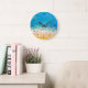 Uma aquarela tropical de uma praia com ondas intermitentes como um relógio de parede único. Aquarela por Daphsam.