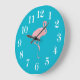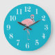 Clock is shown in a solid color of turquoise with a cute flamingo.