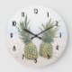 Um relógio com uma fotografia com um par de abacaxi sentado numa praia arenosa.