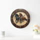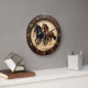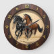 Bring the spirit of the wild into your home with this stunning equestrian-themed wall clock. The design features a high-definition image of two powerful stallions—one jet black and one rich bay—galloping through desert sands. The central artwork is set against a warm, neutral background that creates a beautiful 3D-style depth, making the horses appear to leap off the clock face. A deep, dark wood grain print surrounds the center, accented by bold golden numeric markers that offer a sophisticated and high-contrast look. While the face mimics the appearance of a heavy wooden heirloom, it is a lightweight and durable graphic timepiece. This high-energy design is the perfect self-gift for horse lovers or anyone wanting to add a dynamic and polished focal point to a study, living room, or ranch-style home.