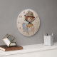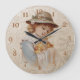 Ilustração vintage adorável sobre presentes e roupa apresentando uma jovem garota vestindo um chapéu com flores margaridas e berrando um punhado de filhotes com seu avental.