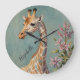 Uma girafa majestosa se posiciona entre as flores lavandas colocadas contra um céu azul pastel calmante. O seu longo pescoço e corpo, enfeitados com padrões únicos, atinge graciosamente o céu acima. Você sabia que cada girafa tem um padrão único de manchas, muito parecido com digitais humanas? Essa design capta a beleza serena desse gentil gigante, misturando sua impressionante estatura com os delicados detalhes de seu entorno.