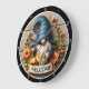 This charming wall decor features a friendly gnome in a blue hat holding a lantern, standing amidst vibrant orange flowers and green foliage. A banner across the bottom reads WELCOME, making it an inviting accent for any home. A delightful item to add warmth and whimsy to your living space.