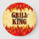 A Grill King BBQ slogan in a western smoldering font for cooks and cookout chefs, with graphic art of red and orange flames top and bottom of this design on a rustic grunge background.