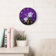 Um relógio divertido assustador com um design de halloween assustador. Colocada num cemitério escuro e assustador. Um cascalho diz RIP, com uma vela e alguns crânios brilhantes no chão. Uma vedação cremosa velha se inclina para o lado. Um adorável esqueleto sorridente está acenando e alguns fantasmas legal estão girando no ar. Colocado sobre um fundo de gradação preto e roxo.