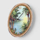 Uma arte do vintage do dominio público de uma ilha com palmeiras, flores, oceano e nascer do sol ou por do sol de um livro de histórias da bíblia das crianças.