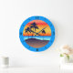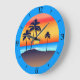 Relógio na imagem de uma ilha tropical com palmeiras, contra um pôr do sol laranja e um oceano de turquesa, com borda de turquesa