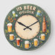 This is a wall clock featuring a dark green border and a light beige face. The phrase "IT'S BEER O'CLOCK" is written around the top and bottom in large, three-dimensional, light-colored block letters. The outer border is decorated with various sizes of illustrated beer mugs and glasses filled with foamy, golden beer. The hands and minute markings are black. The design may look real due to the high detail and three-dimensional texture in the artwork.