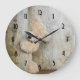 Um relógio com uma fotografia de querido de um urso de pelúcia fofo, em pé por uma parede russa de madeira / pano de fundo.