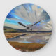 Uma design de arte de um lago com o dramático céu refletido na água do lago. Colinas e campos circundam o lago.