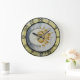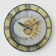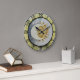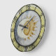 Este relógio apresenta uma lua e um sol contra um fundo azul claro. Está rodeado por uma estrutura antiga colorida, com números pretos a envolverem-se. Perfeito para aqueles que desfrutam de celestial, cosmos ou decoração espacial.