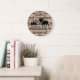 Um design personalizado rústico, único, de um tipo apresenta um fundo de madeira falsa com pinheiros, um alce e as palavras, "OS WILLIAMSONS VIVENDO NA MONTANHA TIME EST. 20XX" em tipografia negra. Personalize este relógio adicionando suas próprias informações pessoais. Faz um excelente de casamento, aniversário ou presente de inauguração. Clique em "personalizar este modelo" para alterar os nomes e as fontes para criar um design único de um tipo. Que cúmplice agradável para sua sala de estar, quarto ou sala de família. Se precisar de ajuda para personalizar, envie-me um e-mail para o site @gmail.com. Obrigados para parar em www.zazzle.com/WhisperingPines. ©Karen HallA rusticidade