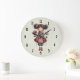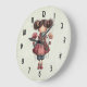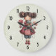 Um relógio com uma imagem retrô fofa apresentando uma menina caprichosa com bochechas rosadas e flores no cabelo. Carregando uma boneca de sapo verde.