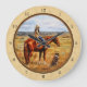 Uma jovem vaqueira espera que seu pai se recupere para que comecem a arredondá-lo. Tudo em um fundo de padrão amarelo pálido.