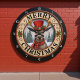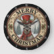Esta é uma ilustração festiva e encantadora de sinais circulares que apresenta uma rena num cenário de neve e arborização. A rena está vestindo um chapéu vermelho de cima, adornada com bagas ocas e um cachecol xadrez vermelho e preto. O fundo mostra uma pacífica cena de inverno com árvores cobertas de neve. A imagem é enquadrada por uma fronteira rustica, texturizada de madeira, com padrões florais de ornamentado e as palavras "MERRY CHRISTMAS" escritas em letras negrito e curvas. O design inteiro tem uma sensação quente de feriado.