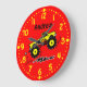Este divertido relógio de parede personalizado é perfeito para amantes de caminhões. Tem uma design com um caminhão monstro de desenhos animados. O caminhão está amarelo com chamas. Você pode mudar a cor de fundo para qualquer um que quiser. Altere o nome na modelo para personalizar. Adicione o nome do seu filho em vez do nome do exemplo. Ele terá um relógio único para o quarto. Há números e pontos amarelos para os minutos. Você pode excluir qualquer um desses, se quiser. Encontre outros designs de relógio de parede personalizados no Lápis da Alina.