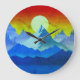 Montanha Rocky Hour Sun Art Clock Lindas Montanhas Rochosas Azuis com o sol brilhando na hora do ouro com tons de vermelho, laranja e amarelo. Compre a nossa loja para mais designs de decoração de montanhas em vários produtos para a sua casa ou casa de campo de montanha.