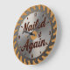This image features a round wall clock designed to resemble a well-worn, rusty circular saw blade. The clock face is primarily a metallic silver with significant rust, corrosion, and wear marks, giving it an authentic distressed look. The outer edge is jagged, mimicking the teeth of a saw. The phrase "Nailed it Again" is prominently displayed in the center, rendered in a bold, dark red or brown font that appears slightly raised or embossed. The numbers 12, 3, 6, and 9 are clearly visible in matching colors, with smaller hash marks for the other hours. Black hour and minute hands are affixed at the center. The overall design evokes a sense of craftsmanship, DIY projects, or the satisfaction of a job well done.