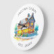 Bonito relógio de Natal com uma bonito cabana de madeira e pinheiros.