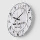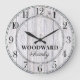 Um relógio rápido e moderno de madeira lavada em celeiro branco batendo monogramas com o nome da família. Excelente para a sua casa ou cabine, ao estilo rústico ou fazenda.