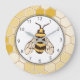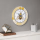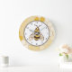 Entregue a ilustração tirada de um bonito bumble a abelha centrada em uma face do relógio branca com números cinzentos e um fundo de hexágonos amarelos alaranjado do favo de mel.