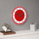 Padrão de círculo de pontos vermelhos, com círculos de linhas vermelhas e brancas como borda de borda. Um estilo retrorreflector contemporâneo que combina com a sua área de decoração doméstica ou bar de cocktail. Simples, simples e divertido para uma hora feliz ou como um touro, ou um design de arte divertido. Disponível na sua escolha de 2 tamanhos e cor do relógio. Manter ou eliminar os números para um estilo de mais partes. Um relógio giro em forma redonda.