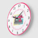 Um relógio redondo com fundo branco e uma borda rosa. Os números são negros. O relógio tem as palavras, "O trabalho doméstico é para aqueles que não sabem costurar" formando um círculo ao redor do desenho de um rosa brilhante e cinzas, vintage, manivela, máquina de costura. É o relógio perfeito para a sua sala de costura.
