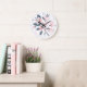 Um relógio com um padrão elegante feito com uma ilustração aquarela de flores cor-de-rosa com folhas e caules de cinza azul.