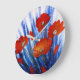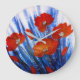 Uma pintura acrílica de papoilas vermelhas, em um campo de grama abstrato azul.