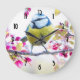 Um relógio com uma fotografia incrível do pássaro mais bonito empoleirado num galho coberto de flores cor-de-rosa e folhas verdes. O pássaro tem uma cabeça azul e corpo amarelo com um rosto muito doce. Adorável.