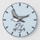 Presente ornitologista. Pássaro voador alto contra o céu azul. Slogan diz Fly High. Relógio para uma pessoa ambiciosa. Relógio de pássaros. Relógio para um observador de pássaros, talvez.