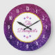 Um relógio com um rico e design elegante com um fundo composto por pedras cintilantes rosa e roxo. Tendência e vibração feminina. Um círculo com uma borda faux-gold-foil colocada sobre cima com a sua dentro de texto. O texto também é cercado por uma imagem de joias cor-de-rosa e roxas em forma de burro.