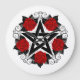 Pentagrama preto com padrão, decorado com floração, rosas vermelhas com folhas em fundo branco. Tatuagem.