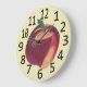 Este relógio de fruta na parede apresenta uma pintura de um pêssego maduro inteiro com uma folha verde. O pêssego é pintado em misturas de vermelho e amarelo. O relógio também tem grandes números negros. Compre online em CherylsArt no Zazzle.