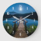 Um relógio com uma bela fotografia de um píer de madeira esticado sobre um lago calmo. O céu noturno coberto de estrelas e uma bela lua de cheio.