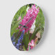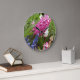 Hyacinth rosa e Muscari roxo/azul florescem neste relógio de parede