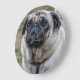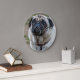 Uma bela fotografia de um cão de cão impresso num relógio de parede redonda.