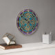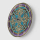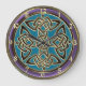 Pulso de disparo celta azul, roxo e Dourado ciano do nó. Um nó quaternário celta em um ouro metálico e design preto em um verde azul ciano ou da cerceta e em uns números redondos roxos do pulso de disparo de parede e os metálicos do ouro. Os nós celtas são uma forma de arte celta favorita tradicional caracterizada não tendo nenhum começo ou extremidade. O nó quatro-tomado partido simboliza a força e a proteção, como um protetor.