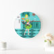 Com este pulso de disparo de parede acrílico redondo da cozinha retro, você pode comer sua torta e comê-la, demasiado. Este desenho kitschy, minimalista da arte caracteriza uma dona de casa perfeita dos anos 50, em sua cozinha moderna do meio século. O padeiro bonito está vestindo um flouncy, o vestido do verde e um avental branco com detalhe vermelho. Não um cabelo em sua cabeça loura é fora do lugar. Em uma mão, está guardarando a fruta de seu trabalho--uma lindo, estrutura cobriu, torta da fruta. Uns relance e você saberão que suas crostas de torta flocosos são em segundo a nenhuns. Está estando em um assoalho do tabuleiro de damas do aqua e da cerceta, de que esteja indubitàvelmente limpo bastante comer fora. Contra uma parede do aqua, nós vemos o cabinetry da cerceta com trabalho da guarnição do aqua, uma bancada vermelha, trações vermelhas da gaveta, e acentos pretos do starburst. Um vermelho, pulso de disparo do starburst está pendurando na parede. Ao lado, há um refrigerador avançado, branco com punhos de prata. Pelo menos, o refrigerador era in 1950 avançado. Agora, é apenas sonhador liso! Se você é Homemaker de Suzie ou tem simplesmente uma afinidade para todo o vintage das coisas, você é certo amar esta fatia deliciosa de americana.