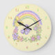 Um design colorido do folkart: em um fundo amarelo pálido senta um arco-íris, as bordas inferiores são cobertas em flores bonito, e duas borboletas - uma no amarelo, um no azul - estão voando acima. Os números dos clock´s textured em cores do arco-íris, demasiado.
